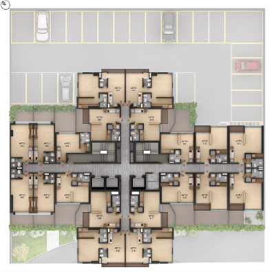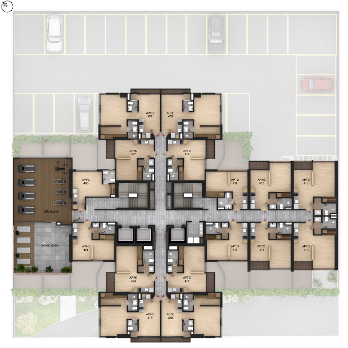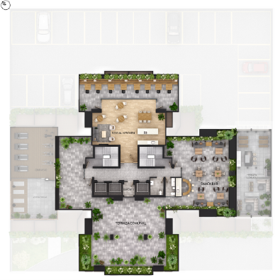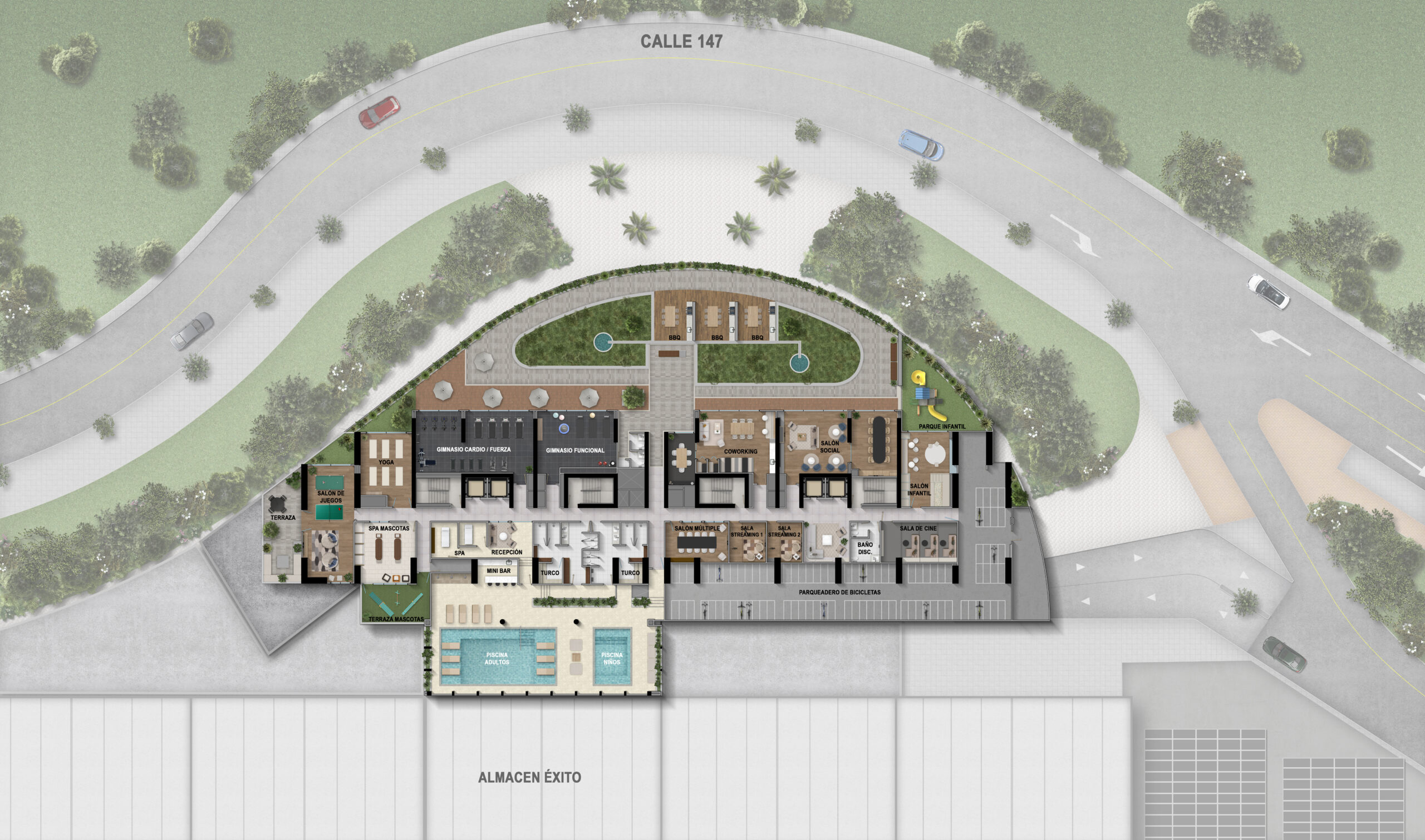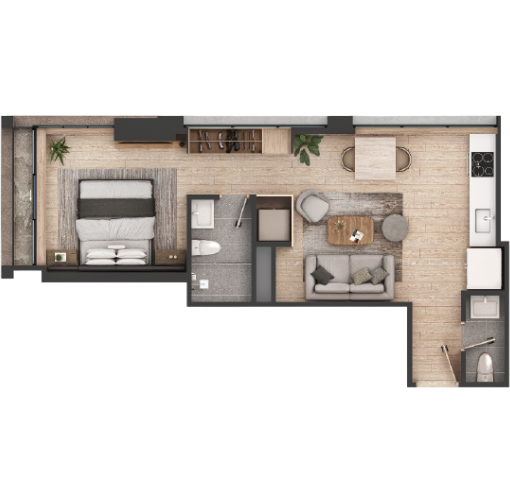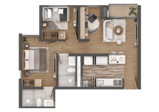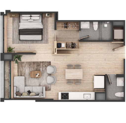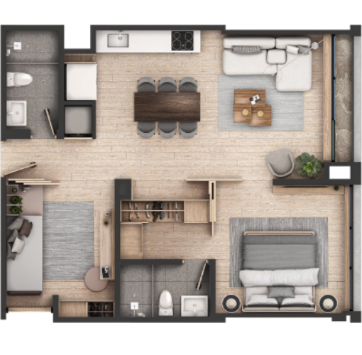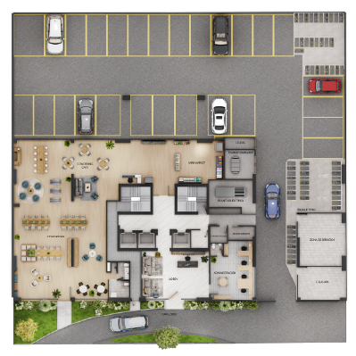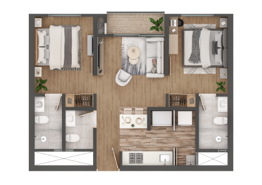 Representaciones en 2D con materiales arquitectónicos y mobiliario, perfectas para brochures y materiales de sala de ventas.